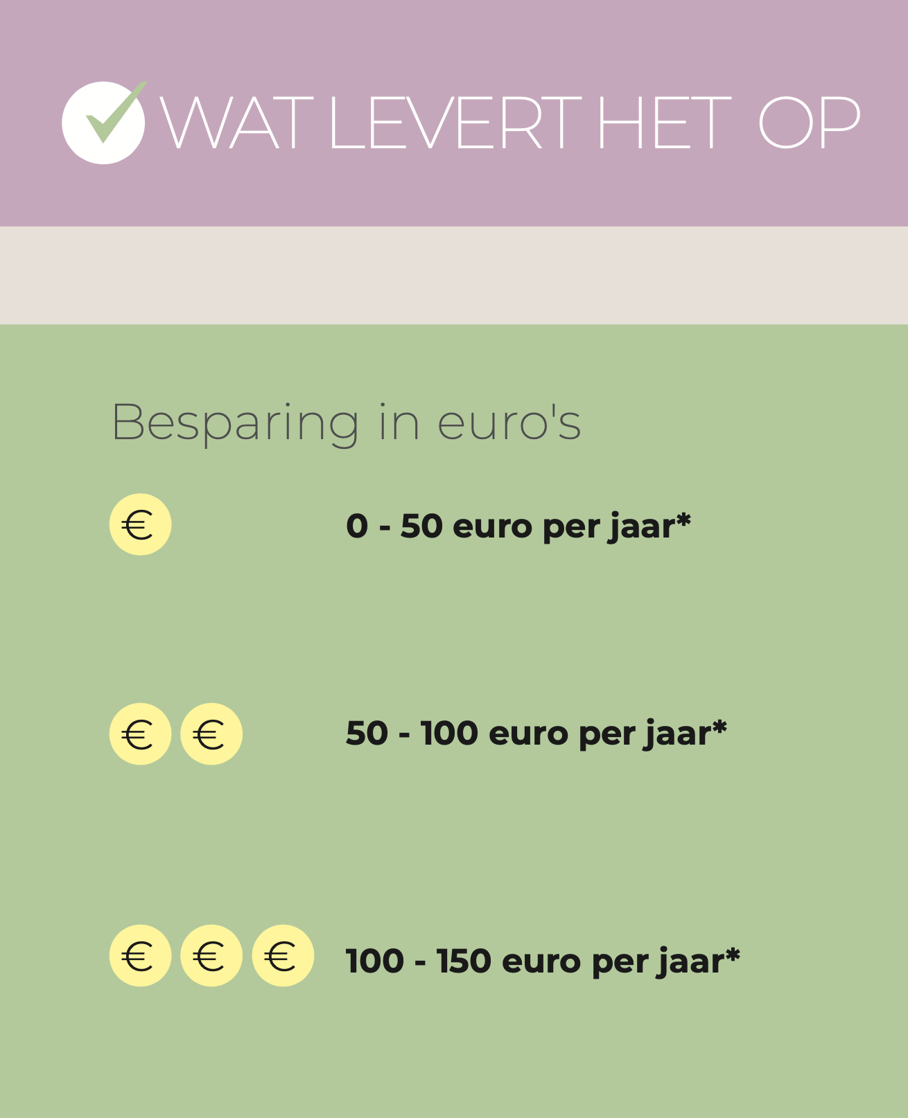 Let op: de besparing is een schatting en geen garantie. Hoeveel je daadwerkelijk bespaart, hangt af van jouw persoonlijke omstandigheden.